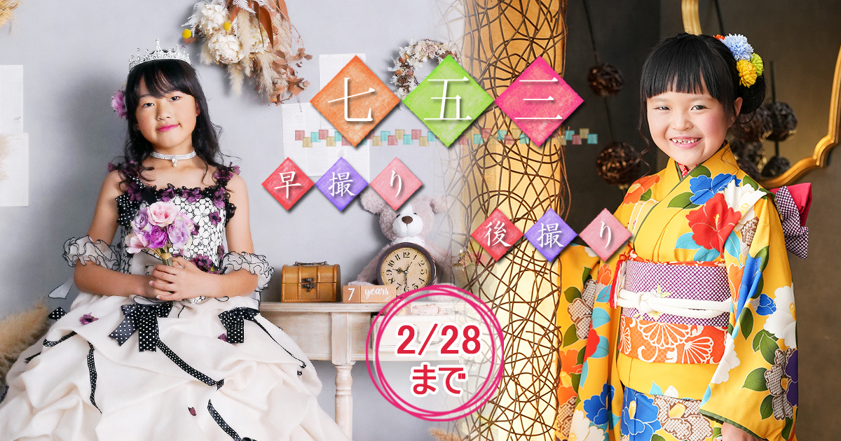 キャンペーン 七五三 後撮り・早撮り 期間 2026年2月28日まで 内容 データプラン データ20カット増量 プリントプラン プリント商品10%OFF 子育てパスポート提示 500円OFF プランページ キャンペーン 開催中 レンタル振袖展示会開催 ひな祭りフォト